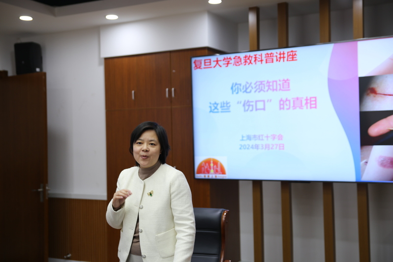 随后,上海市儿童医院普外科护士长、副主任护师、上海市红十字会专家范琴,结合临床案例和视频动画等方式,就外伤的分类及治疗措施进行了科普,包括外伤出血的正确处理方式,烫烧伤的常见类型、症状和急救五步法则等,并现场演示了如何正确使用创伤救护中常用的敷料、绷带、三角巾和夹板等。